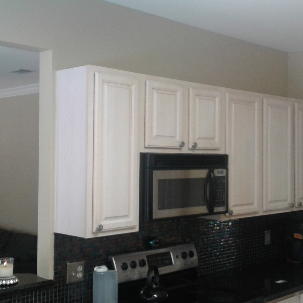 Having just bought a new home and in need of Professional Cabinet Painting & Refinishing services in Pensacola, FL a lovely couple contacted B&B Signature Painting for a personal design consultation. Saddled with these traditional pickled oak cabinets luckily paired with accent iridescent back-splash and counter-tops, this Kitchen desperately needed Our Signature Finish to compliment the client's classic taste.